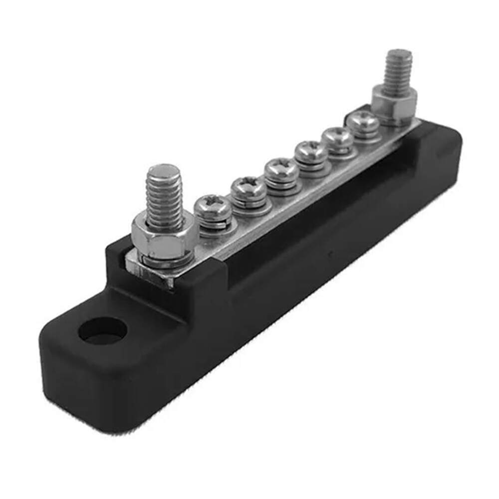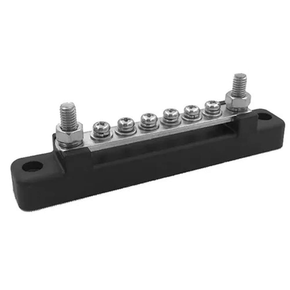 Barramento de bateria marinizado com base em plástico ABS e placa de contato em cobre, parafusos em inox para uso em todo tipo de embarcação, pequena, grande, lancha ou veleiros.