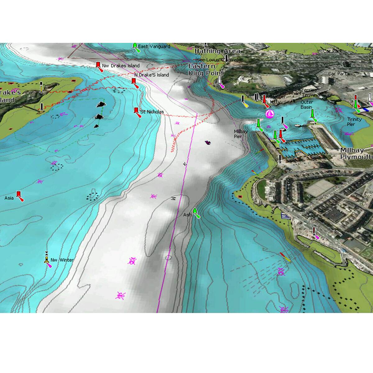 • Sobreposição de imagens de satélite com informações de fundo, ideal para entrada de portos e locais complexos;
