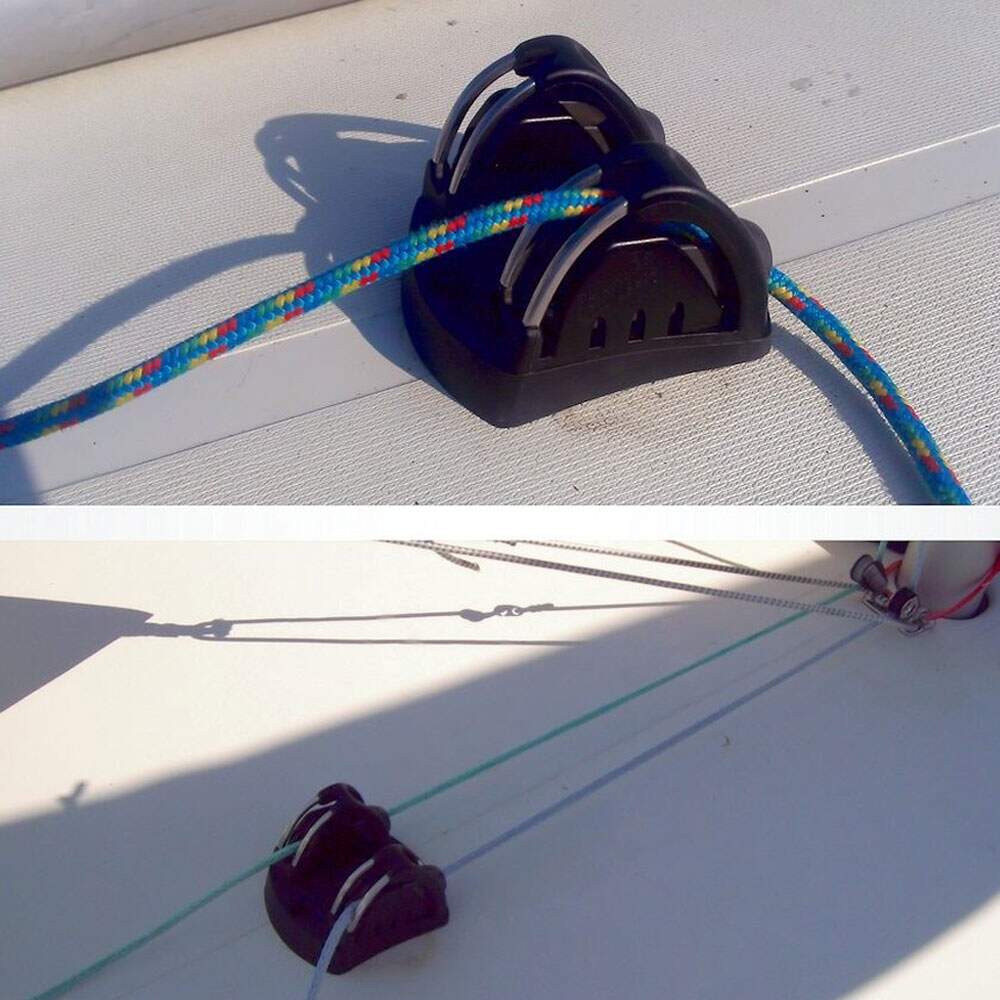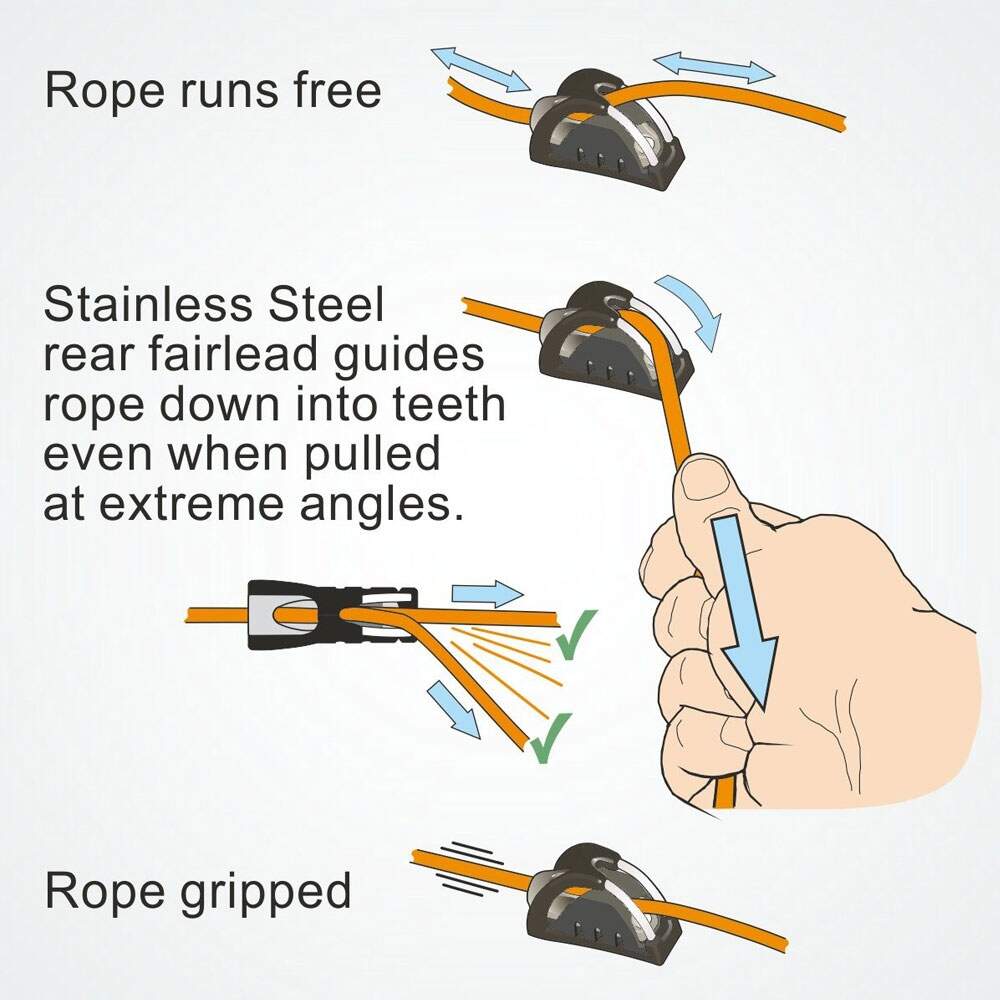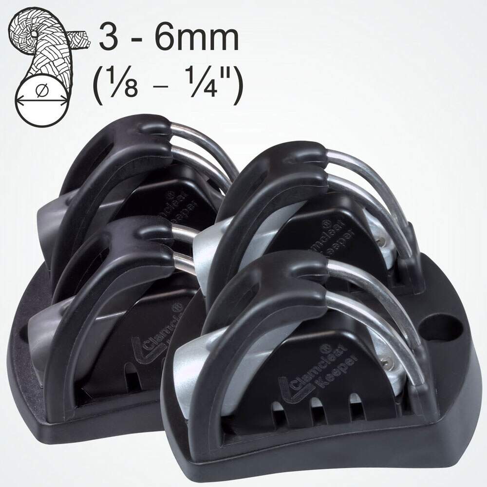 Patenteado Clamcleat® Keeper desvia o cabo dos dentes do encaixe quando é necessário um rápido ajuste e liberação da vela. O passador permite que o cabo seja preso em ângulos de até 70º e há um clique positivo e audível quando o cabo estiver preso, sendo excelente quando comparado aos métodos alternativos de fixação.