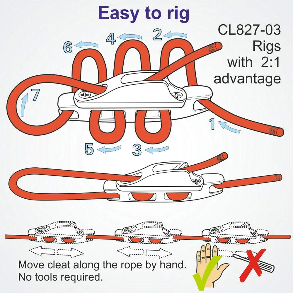 O Clamcleat® CL827-03 é uma versão totalmente em nylon do maior grampo Aero. Leve e fácil de ajustar manualmente.