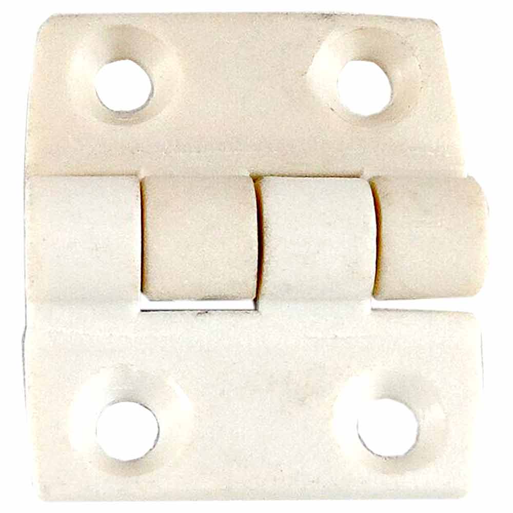 Dobradiça com 4 furos feita de Plástico na cor Branca.