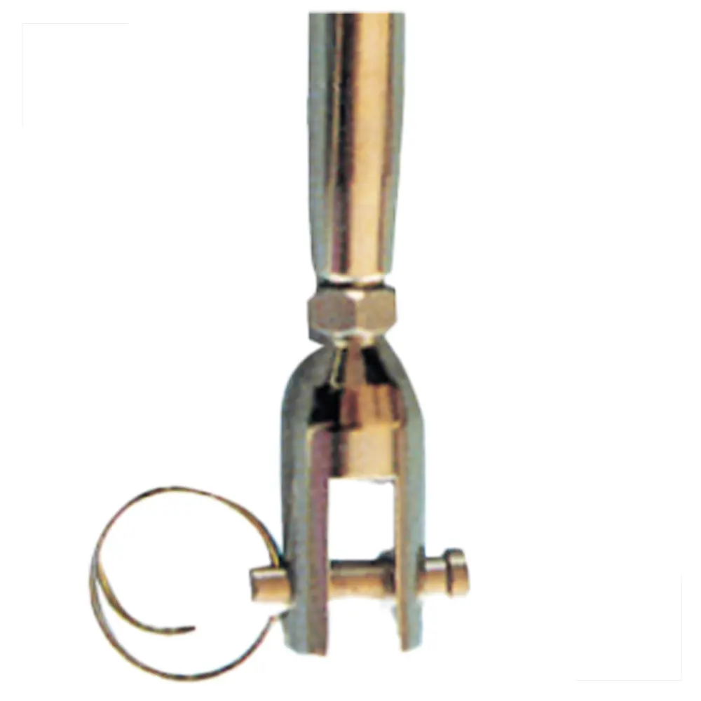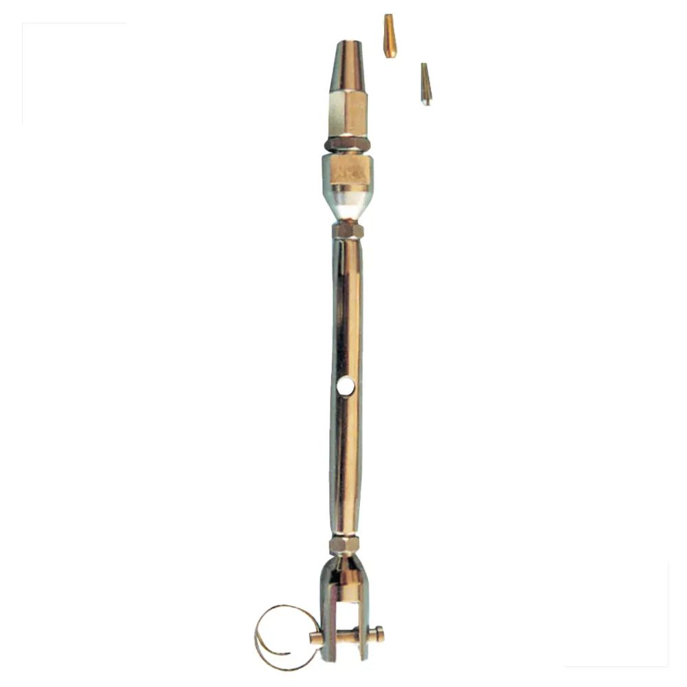 Esticador para estaiamento de veleiros produzido em aço inoxidável, com fixação por garfo e conexão rápida com o cabo (tipo Norseman).