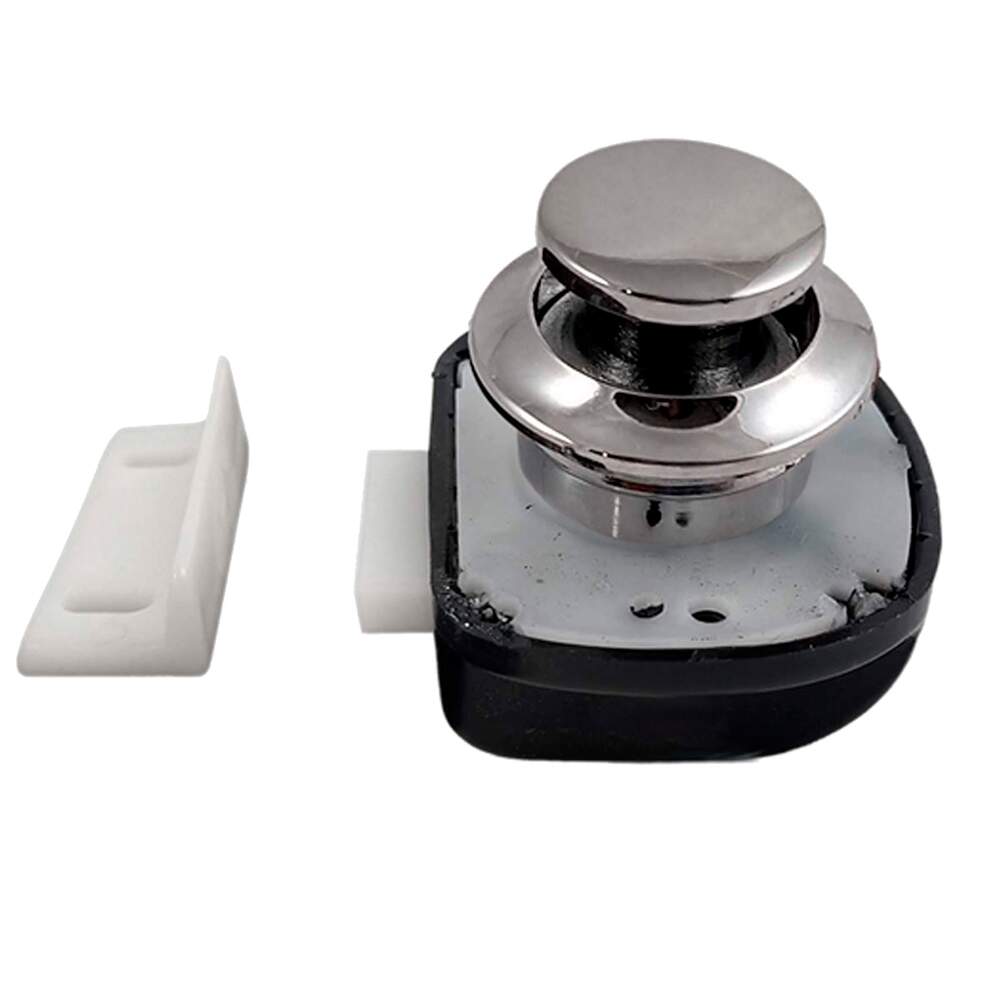 Possui mola de pressão que retorna o botão para posição de abertura e apertando fica embutido. O botão fica embutido quando fora de uso, e ao precisar puxar a porta ou tampa, basta dar um clique que o botão salta.