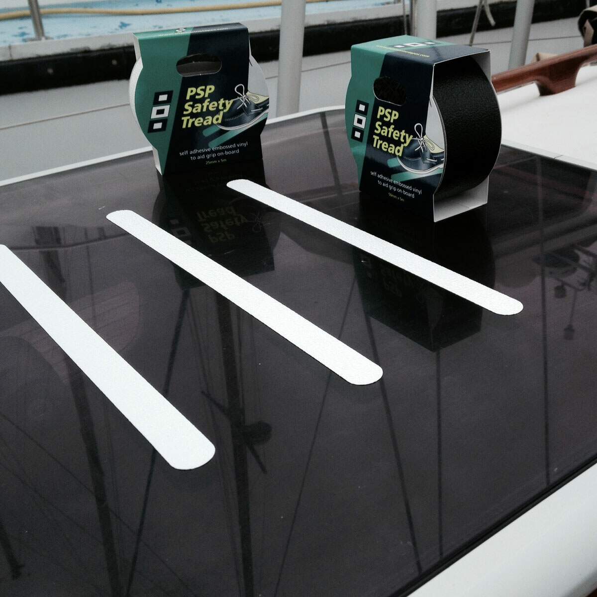 Fita antiderrapante é essencial para aquelas partes do barco que estão muito lisas e podem provocar sérios acidentes. Decks, tampas de gaiuta e escadas são exemplos onde pode ser facilmente aplicada facilmente já que possui um forte adesivo autocolante.