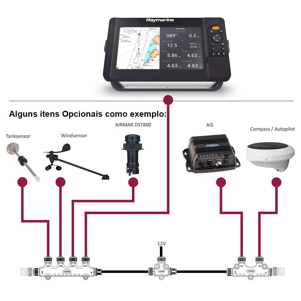 Conectividade: Uma porta para rede NMEA2000 ou SeatalknG (com adaptador A06045 não incluído) para conexão com AIS, Monitoramento de Motor e ou tanques, Estação de Vento e instrumentos de apoio.