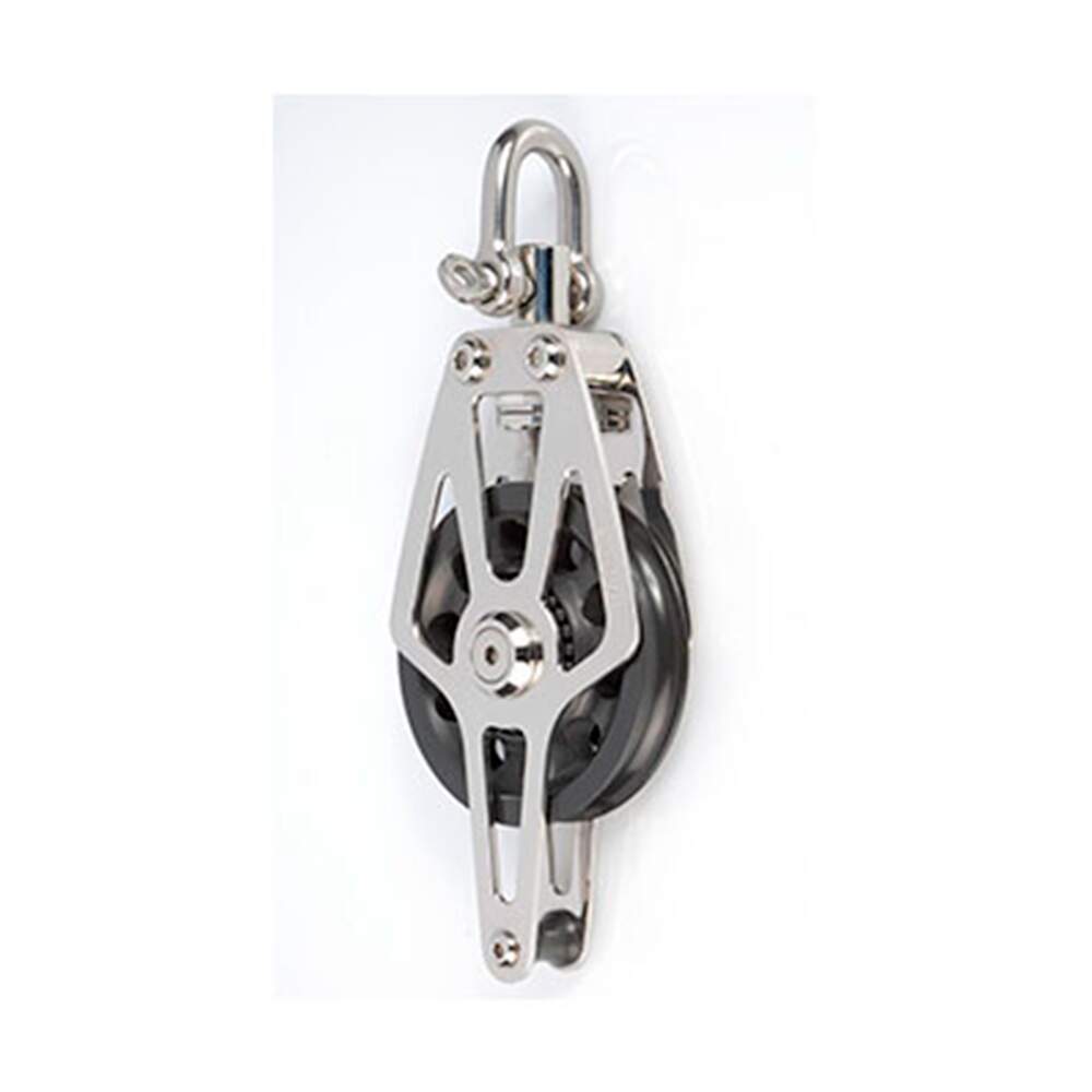 Moitões em inox polido sempre combinam com grandes veleiros. Roldana em alumínio sobre mancal de composite para performance e durabilidade.