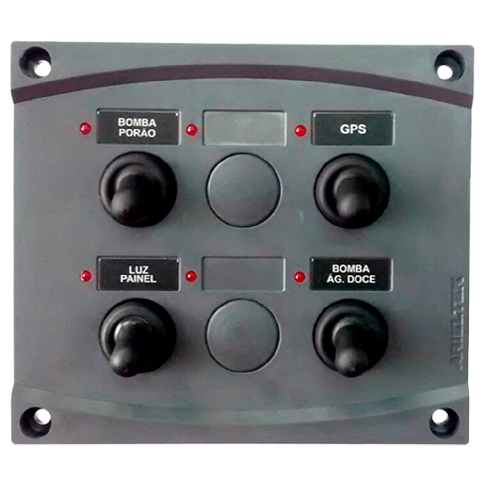 Painel de Comando elétrico para lanchas e veleiros a prova de respingos d´água com quatro interruptores, sendo duas chaves para função LIGA/ DESLIGA, uma chave para a função BUZINA e outra para a função BOMBA DE PORÃO. Possui led indicador de função e acompanha cartela de etiquetas com 10 funções.