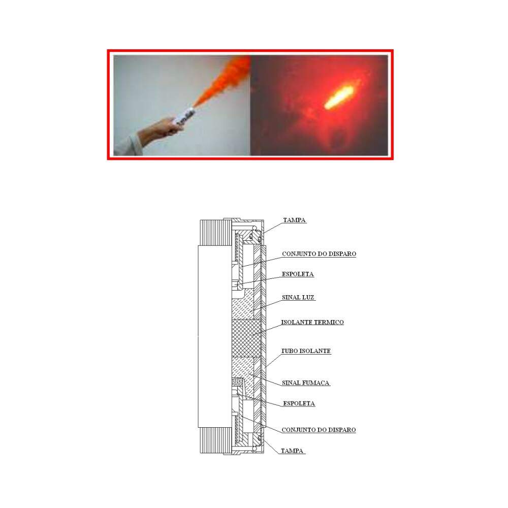 Emite um sinal de fumaça da cor laranja durante o dia e à noite emite um facho de luz vermelha de grande intensidade luminosa. O sistema de acionamento é manual, com funcionamento imediato depois do disparo.
