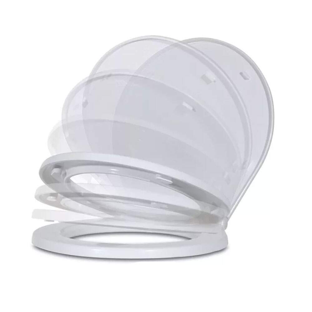 Assento e tampa, produzidos plástico de alta resistência, na cor branco, com sistema de fechamento soft suave.