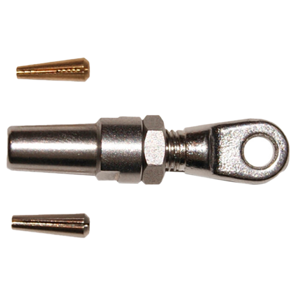 Terminal para estaiamento de veleiros produzido em aço inoxidável, com fixação por garfo e conexão rápida com o cabo (tipo Norseman).