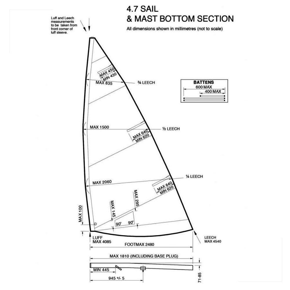 • A vela Laser 4.7 tem 4,70 m2 e é feita de Dacron 4,5oz (127g);