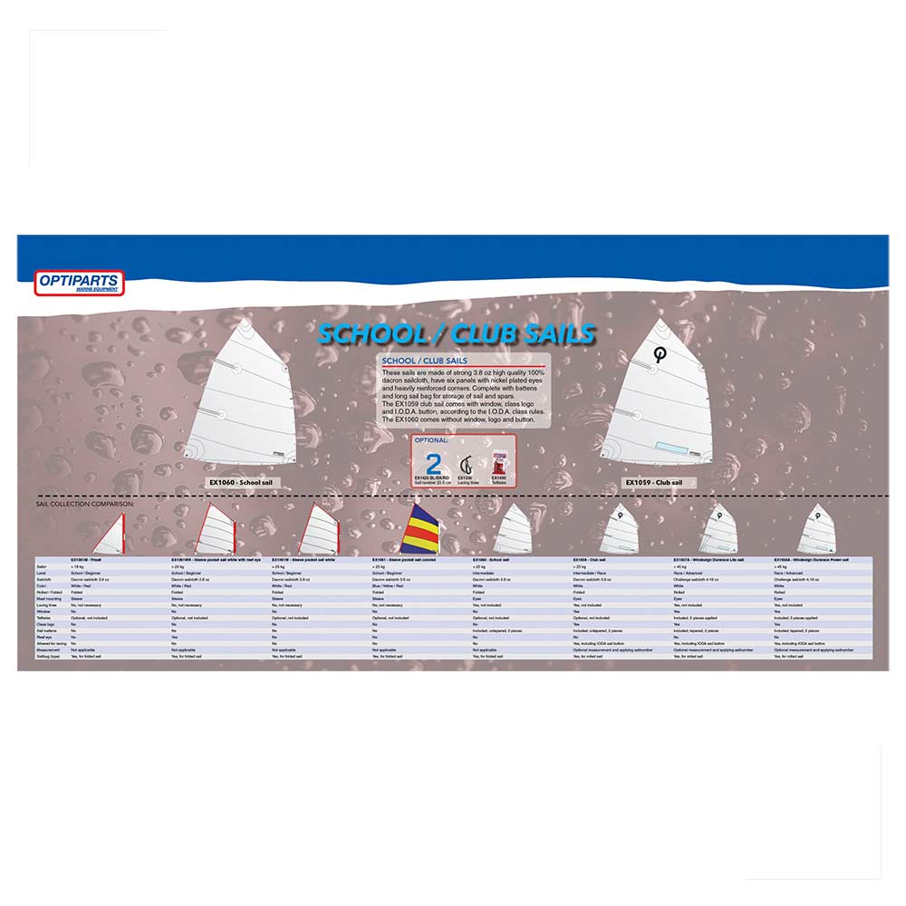 Completa, vem com as logo da classe, talas e bolsa para facilitar o armazenamento e transporte. Esta vela é totalmente de acordo com as normas IODA, incluindo janela transparente, e botão de regata IODA.
